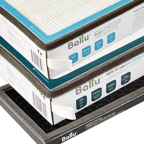 | Ballu ASP-200 | Префильтр (моющийся), M5 (средней очистки), HEPA H13, карбоновый | Крупные частицы (пыль, пух); микроорганизмы (>1 мкм); аллергены, вирусы, бактерии (от 0,3 мкм), запахи |